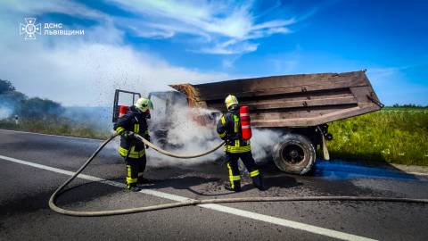 Вчора, 27 червня, о 15:33 год у селі Криниця Стрийського району на дорозі "Пісочна – Східниця" під час руху виникла пожежа в вантажному автомобілі КАМАЗ, який перевозив 5 тонн зерна.