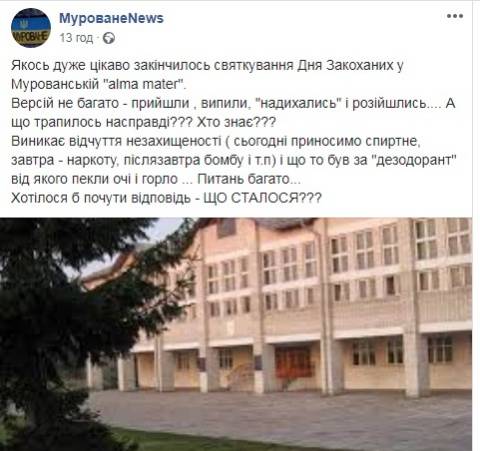 Під час святкування Дня закоханих учні 10 класу Мурованської ЗОШ принесли у навчальний заклад алкогольний напій.