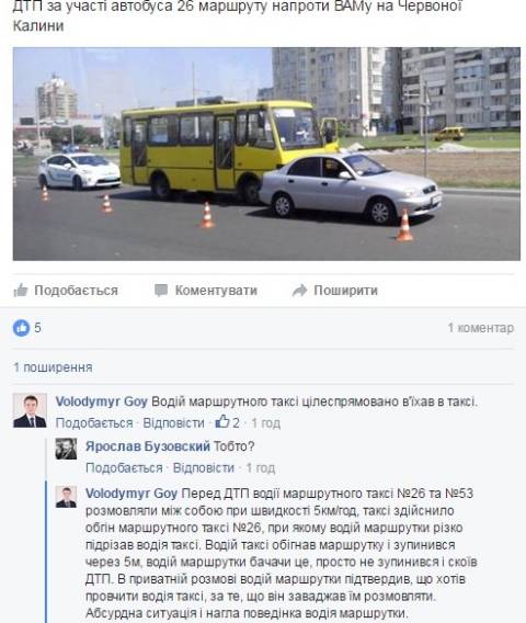 "У приватній розмові водій маршрутки підтвердив, що хотів провчити водія таксі за те, що він завадив їм розмовляти. Абсурдна ситуація, і нагла поведінка водія маршрутки", – написав очевидець аварії.