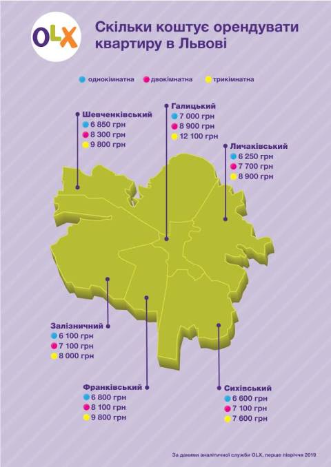 У першому півріччі цього року, за результатами дослідження OLX, Галицький, Шевченківський та Франківський райони лідирують щодо вартості оренди житла у Львові. Зокрема, оренда однокімнатної квартири у центрі міста тут вартує від 7 000 грн в місяць, у Шевченківському районі – 6 850 грн, а у Франківському – 6 800 грн.