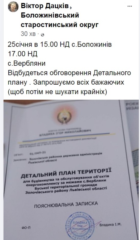 Завтра, 25 січня, у селі Боложинів відбудеться обговорення детального плану території для будівництва та обслуговування об’єктів енергокомплексу за межами в селі Вербляни Буської територіальної громади Золочівського району.