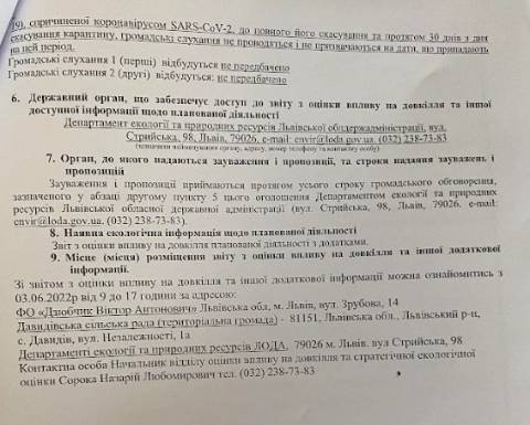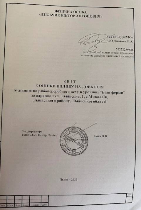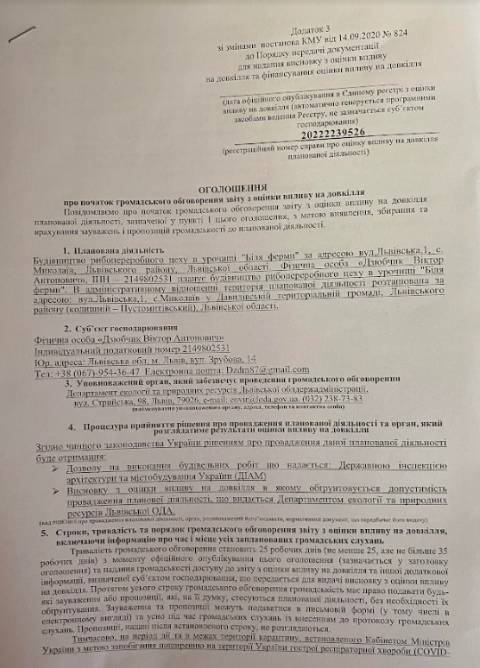 Давидівська сільрада оприлюднила звіт з оцінки впливу на довкілля заяву про визначення обсягу стратегічної екологічної оцінки через будівництво рибопереробного цеху в урочищі "Біля ферми" на вул. Львівська, 1 у селі Миколаїв Львівського району.