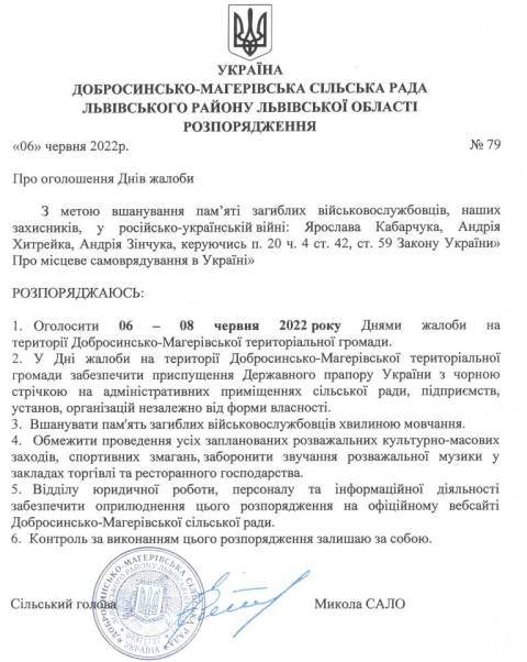 Сьогодні, 6 червня, голова Добросинсько-Магерівської сільської ради Микола Сало підписав розпорядження про оголошення 6-8 червня Днями жалоби для вшанування пам'яті загиблих у війні з Росією військовослужбовців Ярослава Кабарчука, Андрія Зінчука та Андрія Хитрейка.