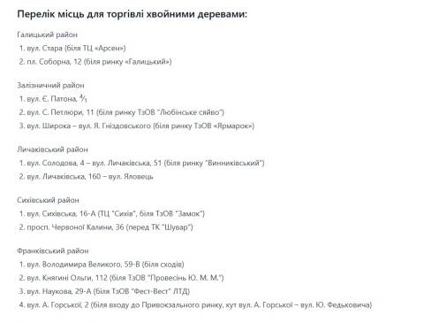 Найбільше майданчиків для продажу ялинок передбачили у Шевченківському районі – їх буде 6, у Франківському – 4 місця, у Залізничному – 3 місця, натомість у Сихівському, Личаківському та Галицькому районах Львова й у Винниках облаштують по два місця для продажу ялинок.