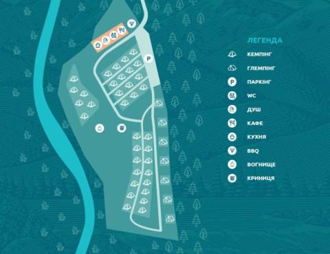 На території кемпінгу передбачені місця для наметів, глемпінг, паркінг, туалети, душ, кухня, кафе, зона BBQ.