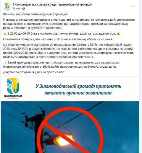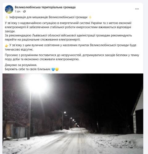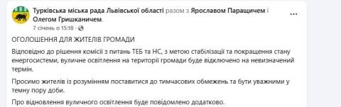 Станом на сьогодні, 20 січня, на території Великолюбінської, Зимноводівської, Новокалинівської, Оброшинської та Турківської громад області через дефіцит електроенергії, спричинений російськими обстрілами, повністю вимкнули вуличне освітлення.