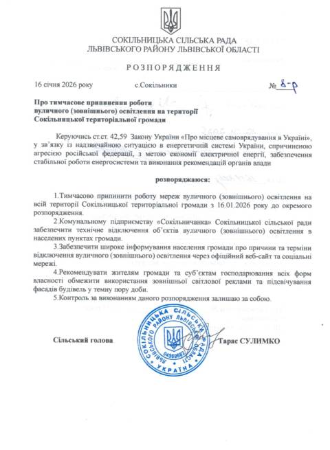 "Відповідно до розпорядження Сокільницької сільської ради від 16 січня 2026 року тимчасово припинено роботу мереж вуличного (зовнішнього) освітлення на всій території Сокільницької територіальної громади.