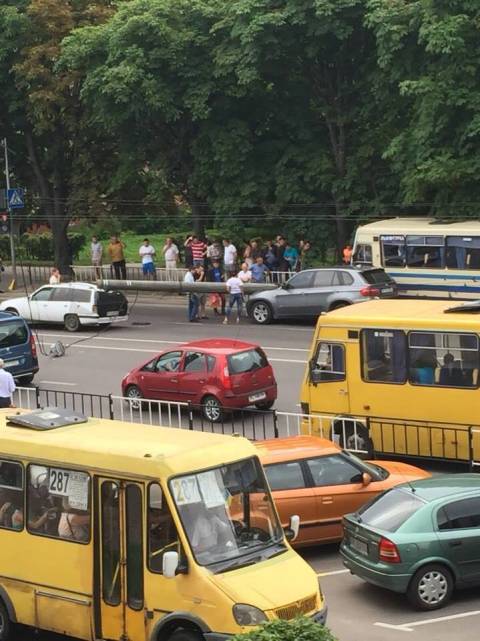 "Сьогодні 24.07.2015 о 10:50 год ДТП на вул. Городоцька біля "Київстару". Маршрутка в'їхала в стовп, а стовп упав ще на 2 машини", - йдеться у повідомленні.