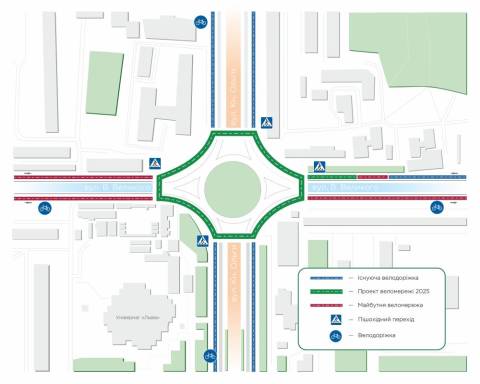 Також існуючий пішохідний перехід на вул. Володимира Великого перенесуть на кілька метрів від кільця у напрямі вул. Стрийської. А додатковий перехід для пішоходів облаштують зі сторони McDonald's, поруч із велопереїздом, що забезпечить наявність пішохідних переходів з усіх сторін кільця.