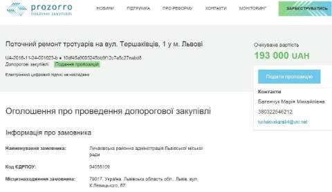 Відтак, Личаківська районна адміністрація Львівської міської ради проводить закупівлю на поточний ремонт тротуарів на вул. Тершаківців, 1 у Львові