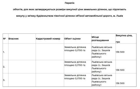 "Затвердити розміри викупної ціни земельних ділянок, що розташовані на території Львівської міської ради (с. Зашків Львівського району), які перебувають у власності фізичних осіб та підлягають викупу для суспільних потреб з метою реалізації проєкта "Будівництво північної ділянки об’їзної автомобільної дороги м. Львів, Львівська область" – йдеться у розпорядженні.
