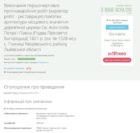 Як вказано у закупівлі, під час реставрації у храмі відновлять фасад, вікна та двері, облаштують огорожу хорів, пофарбують та встановлять захист від блискавок.