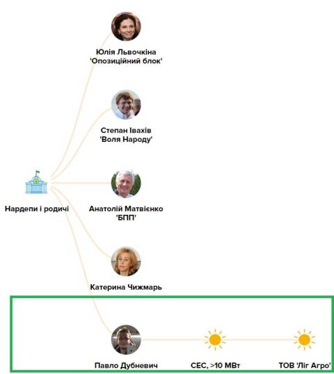 Так, син народного депутата з Львівщини Богдана Дубневича Павло Дубневич є співзасновником ТОВ "Ліг агро", якій належить сонячна електростанція "Озерна", що у Яворівському районі.