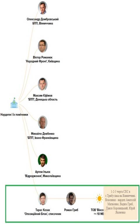 Екс-помічник народного депутата Тараса Козака Роман Гриб є співзасновником ТОВ "Вінсолар", якій належить сонячна електростанція у с. Трибусівка у Вінницькій області.
