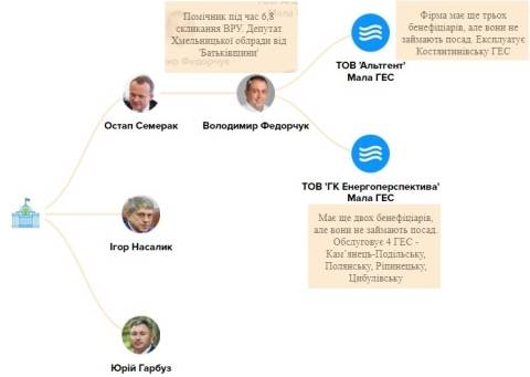 Помічник екс-нардепа, а тепер Міністра екології та природних ресурсів Остапа Семерака, Володимир Федорчук є співзасновником ТОВ "Альтген" і ТОВ "ГК Енергоперспектива", що володіють малими гідроелектростанціями у різних областях (Хмельницька, Миколаївська, Закарпатська).