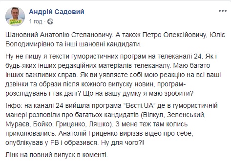 "Ну не пишу я тексти гумористичних програм на телеканалі 24. Як і будь-яких інших редакційних матеріалів телеканалу. Маю багато інших важливих справ З мене теж там колись приколювались" – заявив Садовий.