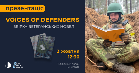 Першою подією літературного фестивалю Львівського міжнародного BookForum, одразу після його урочистого відкриття, стане презентація Voices of Defenders – унікальної збірки новел, яку створили українські ветерани і яка поєднує друкований і аудіоформат.