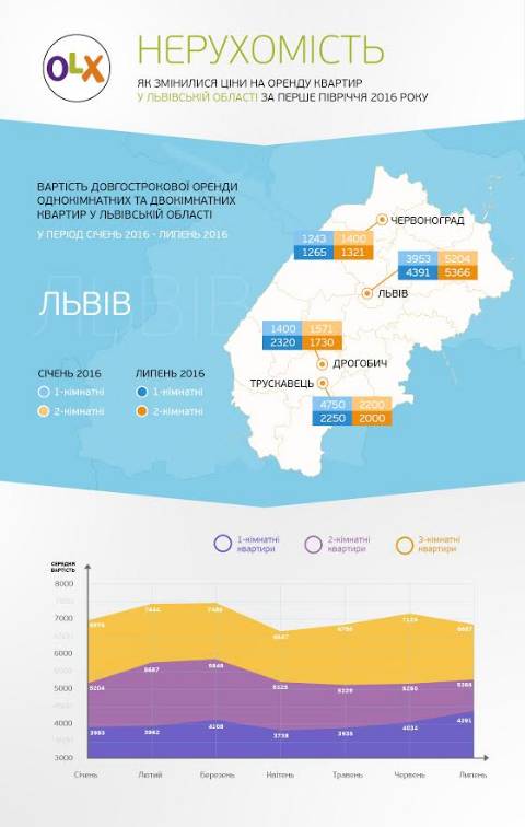 Проаналізувавши вартість оренди житла в області, представлені на онлайн-ресурсі приватних оголошень OLX.ua на Львівщині, аналітики сайту з'ясували, що у Львові ціни за півроку виросли більш ніж на 3%, в райцентрах – до 89%.