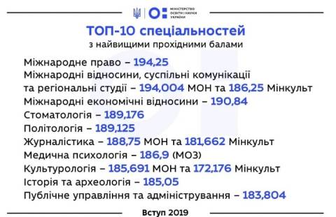 Порівняно з минулим роком у ТОП-10 спеціальностей з найвищими прохідними балами є незначні зміни. Зокрема, знизилися прохідні бали на «Менеджмент соціокультурної діяльності» та «Фармація, промислова фармація», які торік посідали 4 та 9 сходинки відповідно. Цього року прохідний бал на них менший за 180.