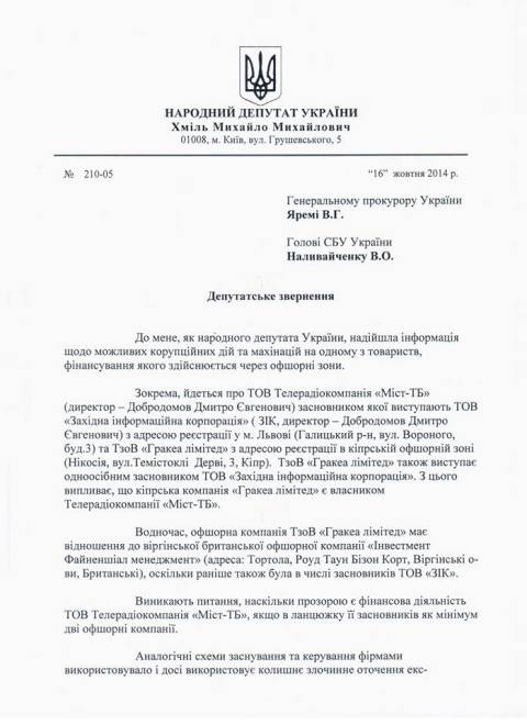 Хміль стверджує, що до нього надійшла інформація про корупційні дії та махінації ТОВ Телерадіокомпанія «Міст-ТБ» (директором якої є Дмитро Добродомов), засновником якої виступають ТОВ «Західна інформаційна корпорація» ( ЗІК, директор – Дмитро Добродомов) та ТзоВ «Гракеа лімітед» з адресою реєстрації в кіпрській офшорній зоні (Нікосія, вул.Темістоклі Дерві, 3, Кіпр).