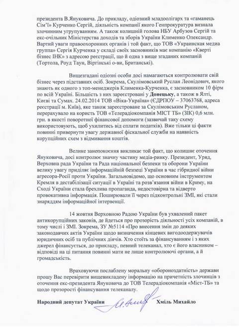Нардеп Михайло Хміль, який балотується на виборах до парламенту у списках "Народного фронту" просить Генеральну прокуратуру перевірити інформацію на причетність оточення екс-президента Януковича до ТОВ Телерадіокомпанія «Міст-ТБ» та прозорості фінансування телеканалу ZIK.