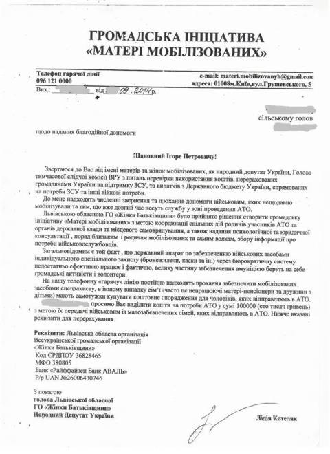 Народний депутат та голова Львівської обласної організації ГО "Жінки Батьківщини" Лідія Котеляк звернулася до одного із сільських голів Львівщини з просьбою виділити 100 тисяч гривень для військових із малозабезпечених сімей, яких відправляють в АТО.