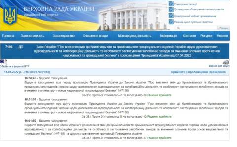 Вчора, 14 квітня, Верховна Рада прийняла законопроєкт №7186, який вносить зміни до Кримінального кодексу України щодо посилення відповідальності за колабораційну діяльність.
