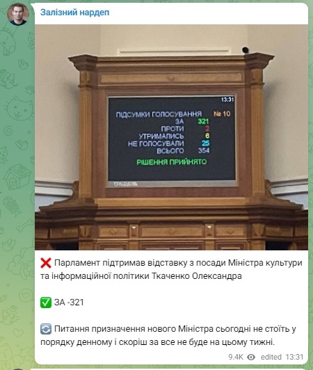 Верховна Рада відправила у відставку міністра культури та інформаційної політики Олександра Ткаченка.