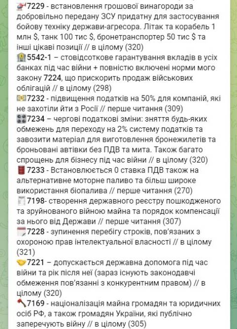 Зокрема, нардепи затвердили у першому читання законопроєкти про заборону символіки, яку використовує РФ у нинішній війні; підвищення податків на 50% для компаній, які не захотіли йти з РФ; заборона політичних партій, які виправдовують чи заперечують збройну агресію Росії проти України.