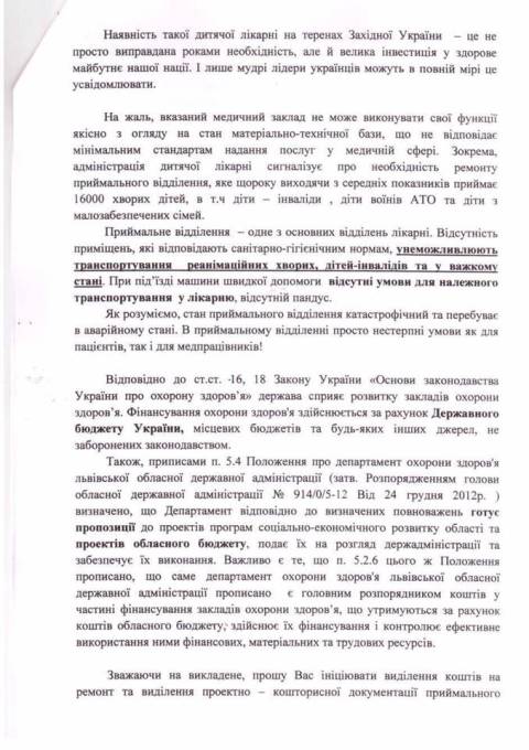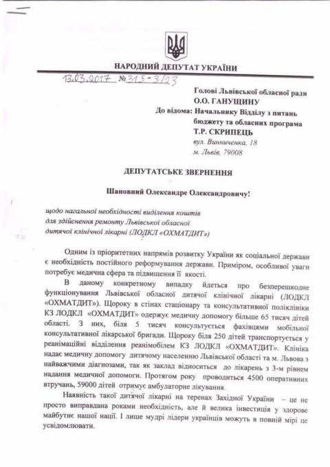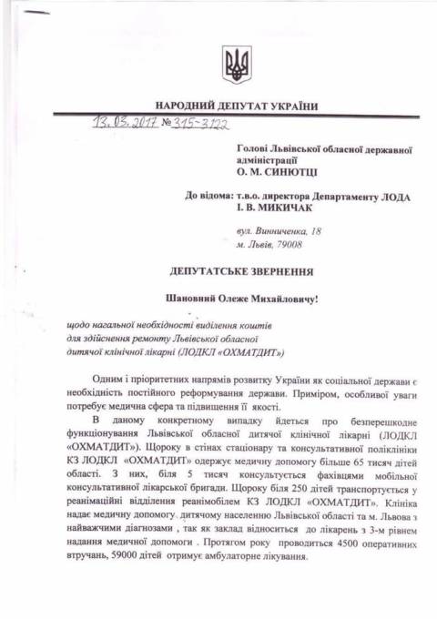 "У лютому під час засідання опікунської ради Львівської лікарні «Охматдит» медперсонал просив допомогти із ремонтом приймального відділення. Тож разом з колегами звернулись до керівництва Львівської облради та держадміністрації щодо необхідності виділення коштів для ремонту лікарні", – заявив Дмитро Добродомов.