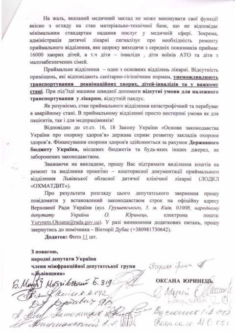 Народні депутати звернулися до влади Львівщини з вимогою відремонтувати приймальне відділення Львівської обласної дитячої лікарні "Охматдит".