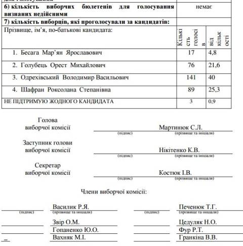 В другий тур пройшли Володимир Одрехівський (40 % голосів) та Роксолана Шафран (25,3 %).