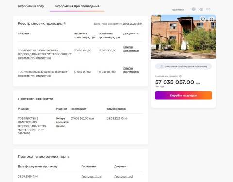 На аукціон, який відбувся 28 травня, подалися двоє учасників: ТОВ "Металворкшоп" та ТОВ "Українська аукціонна компанія", які запропонували за нерухомість 57 605 500 грн та 57 035 057 грн відповідно. Переможцем торгів обрали ТОВ "Металворкшоп".