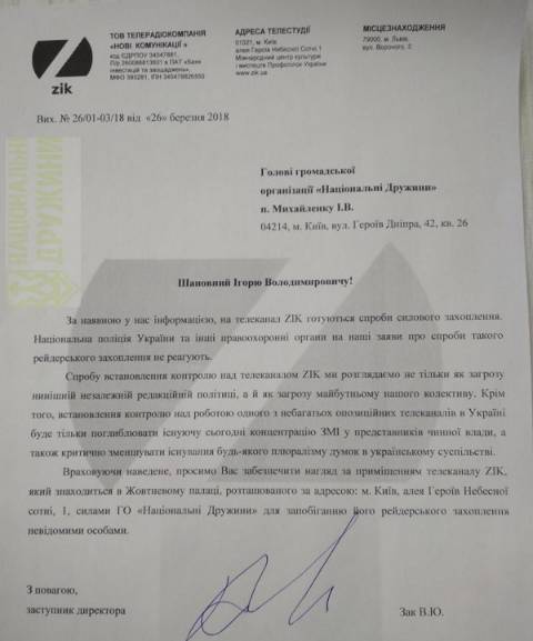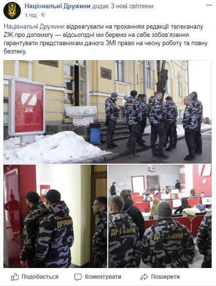 "Національні Дружини отримали інформацію про те, що телеканал ZIK опинився заручником недобросовісних інтриг Банкової та опозиції – готуються провокації, жертвами яких можуть стати прості журналісти, працівники та гості телеканалу, або навіть випадкові перехожі.