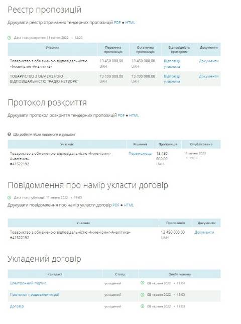 Участь в аукціоні взяли дві компанії: ТзОВ "Інженіринг-Аналітика" та ТзОВ "Радіо Нетворк", які запропонували встановити камери за 13 450 000 грн та 13 490 000 грн відповідно. Переможцем обрали ТзОВ "Інженіринг-Аналітика", а очікувана вартість послуг становила 13 508 093 грн.