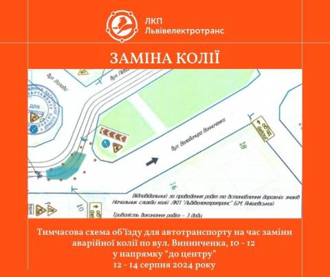 "В ніч з 9 на 10 серпня будуть проводитися підготовчі роботи для заміни трамвайної колії вул. Винниченка, 10-12 (в напрямку до центру). А вже з понеділка, 12 серпня, працівники служби колії ЛКП "Львівелектротранс" планують замінити 50 м аварійної колії та, відповідно, провести замощення міжколійного простору бруківкою. Роботи проводитимемо виключно у нічний час, аби не впливати на зміну трамвайного руху за затвердженими маршрутами. Тому трамваї № 1, 2, 7, 9 вдень курсуватимуть за звичним маршрутом.