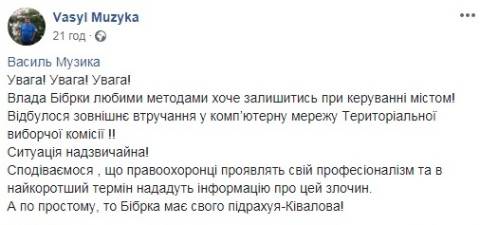 "Влада Бібрки любими методами хоче залишитись при керуванні містом. Відбулося зовнішнє втручання у комп’ютерну мережу Територіальної виборчої комісії", – написав Василь Музика.