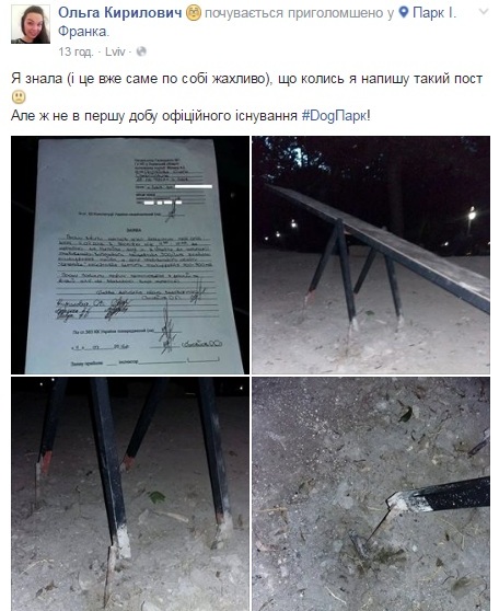 Як зазначила Ольга Кирилович, у проміжку між 14:00 та 19:00 год. на території тренувально-вигульного майданчика для собак хтось зламав атракціон "качелька". Вартість збитків становить близько 700-900 грн.