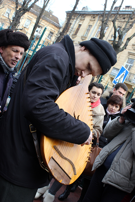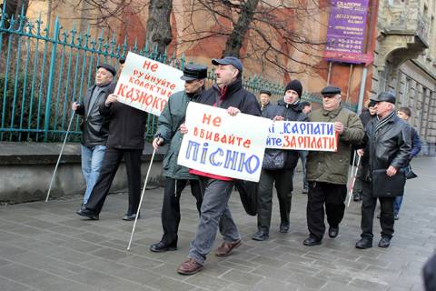 Сьогодні у Львові відбувся звуковий флеш-моб капели незрячих бандуристів «Карпати» у зв'язку з блокуванням зарплати Держказначейством.