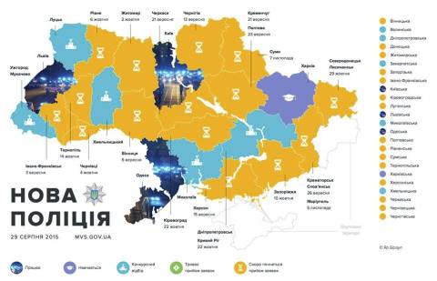 Конкурсний відбір проводиться у 6 містах України: Луцьку, Мукачеві, Ужгороді, Дніпропетровську, Хмельницькому та Миколаєві. У інших містах, починаючи з вересня і закінчуючи листопадом, розпочнеться прийом заявок у нову поліцію.