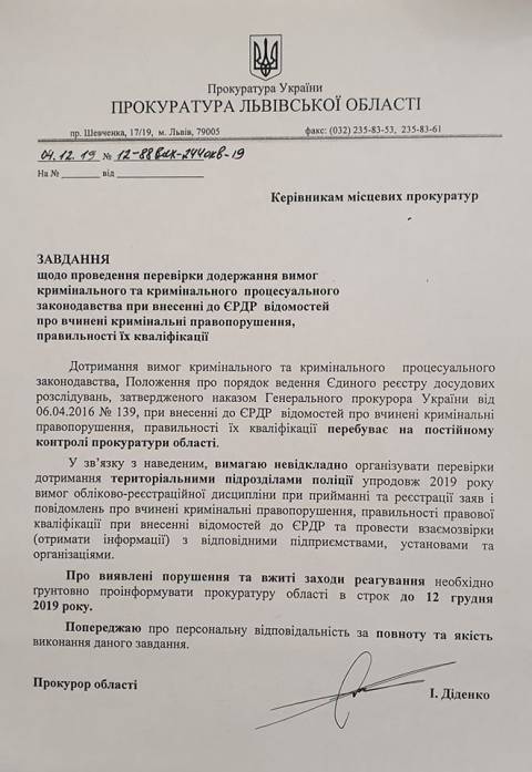 "Вимагаю невідкладно організувати перевірки дотримання територіальними підрозділами поліції упродовж 2019 року вимог обліково-ресстраційної дисципліни при прийманні та ресстрації заяв і повідомлень про вчинені кримінальні правопорушення, правильності правової кваліфікації при внесенні відомостей до ЄРДР та провести взаємозвірки (отримати інформації) з відповідними.підприємствами, установами та організаціями" – додала Ірина Діденко.