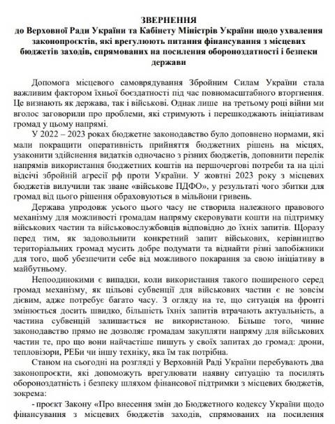 законодавство прямо не дозволяє громадам закупляти напряму для військових частин те, про що вони найчастіше пишуть у своїх запитах до громад: дрони, тепловізори, РЕБи чи іншу техніку, яка їм так потрібна" – вказано у тексті звернення.