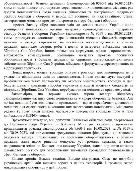 Йдеться про прохання пришвидшити розгляд законопроєктів No 9560-1 від 16 серпня 2023 року та No 9559-д від 30 серпня 2023 року, які нормативно врегулюють питання фінансування з місцевих бюджетів заходів, спрямованих на посилення обороноздатності і безпеки держави, а також напрацювати зміни до Бюджетного кодексу України, якими розв'язати питання фінансового ресурсу для забезпечення виконання громадами повноважень у сфері безпеки та оборони.