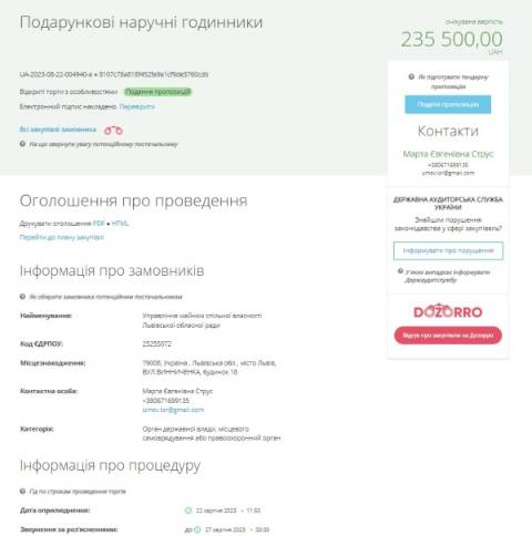 Управління майном спільної власності Львівської обласної ради провело тендер у системі ProZorro на придбання подарункових наручних годинників, які переможець тендеру має доставити до 31 грудня 2023 року.