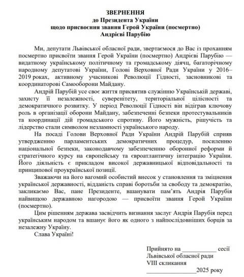 "Зважаючи на його вагомий особистий внесок у становлення та зміцнення української державності, відданість справі боротьби за свободу та демократію, закликаємо Вас, пане Президенте, вшанувати пам’ять Андрія Парубія найвищою державною нагородою – присвоїти звання Герой України посмертно). Цим рішенням держава засвідчить визнання заслуг Андрія Парубія перед українським народом та вшанує його як одного з найпослідовніших борців за незалежну Україну" – вказано у документі.