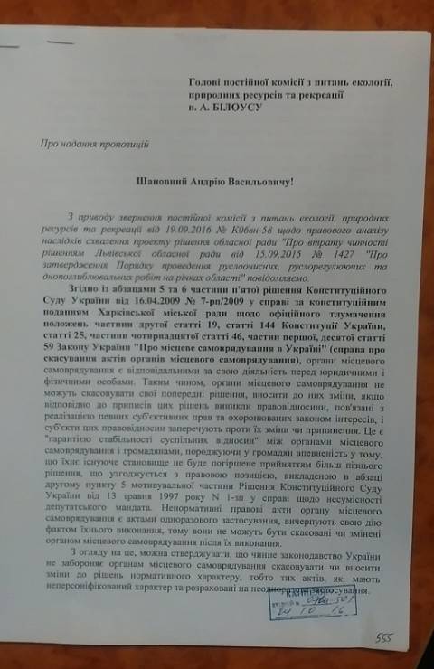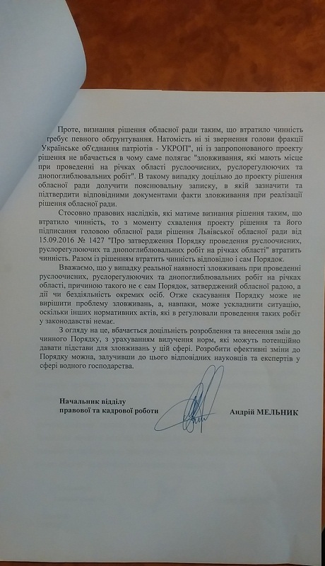 Так у відповіді на звернення голови фракції "Українське об’єднання патріотів "УКРОП" в Львівській обласній раді Петра Жукровського від 30 серпня щодо проекту рішення "Про втрату чинності рішення Львівської обласної ради від 15.09.2015 № 1427 "Про затвердження Порядку проведення руслоочисних, руслорегулюючих та днопоглиблювальних робіт на річках області" начальник відділу правової та кадрової робот Львівської обласної ради Андрій Мельник пояснив:
