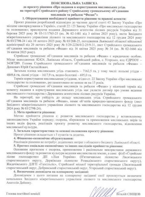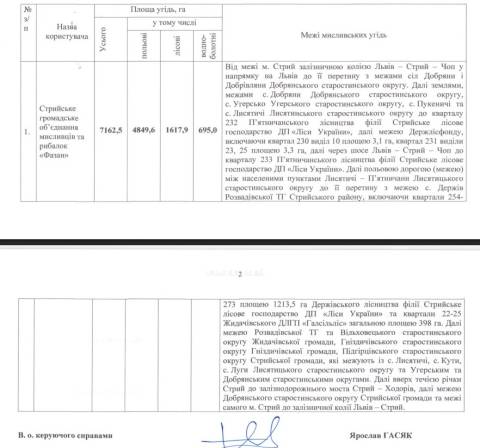 У документі наголошують, що на території, яка увійде до складу мисливських угідь Стрийського громадського об’єднання мисливців та рибалок "Фазан", немає об'єктів природно-заповідного фонду.