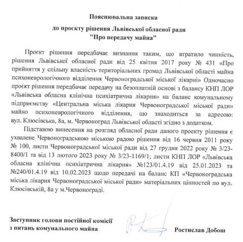 Зокрема, як йдеться у проєкті рішення, облрада, реагуючи на звернення Червоноградської міської ради від 27 грудня 2022 року, вирішила передати з балансу КНП ЛОР "Львівська обласна клінічна психіатрична лікарня" на баланс КП "Центральна міська лікарня Червоноградської міської ради" майно психоневрологічного відділення на вул. Клюсівській, 8а у Червонограді.
