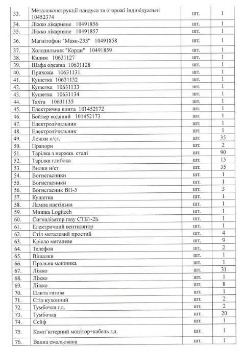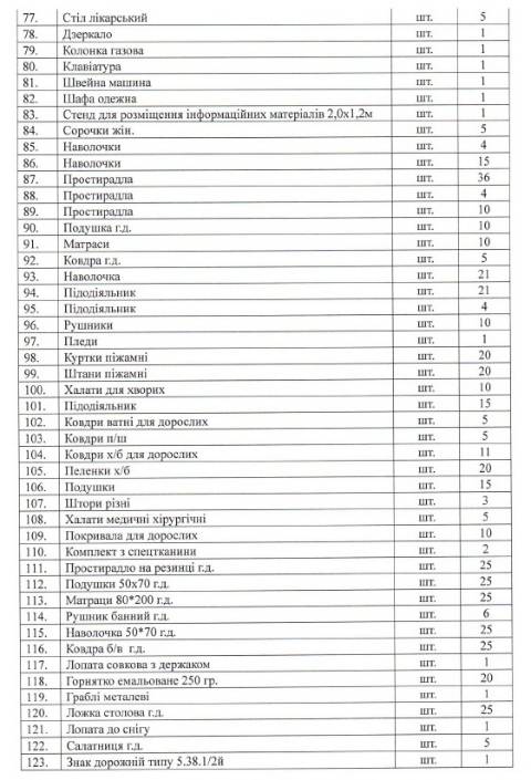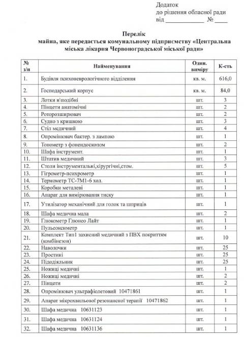 У цей перелік входить будівля психоневрологічного відділення площею 616 кв.м та різноманітне медичне обладнання.