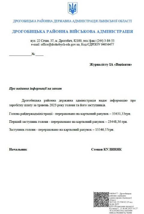 У травні цього року начальнику Дрогобицької районної військової адміністрації Степану Кулиняку нарахували 33 431,33 грн заробітної плати.